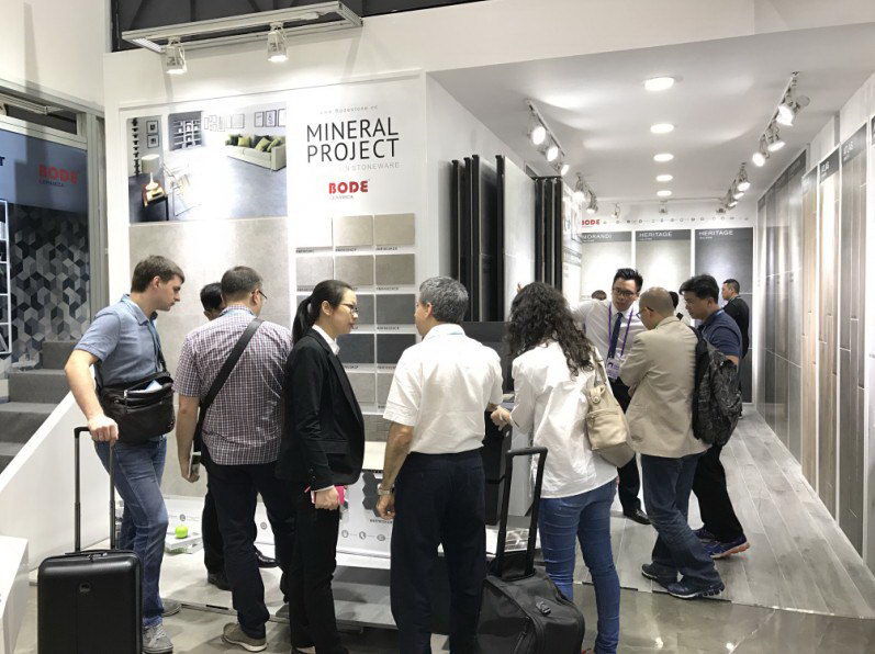 “为充分利用每一寸展位空间,对香蕉视频黄色免费展示进行聚焦,在布展方面花了不少心思。香蕉视频黄版展位外立面是大竖版,各种色系均匀搭配,版面无缝拼接,将瓷石一石N面特色一览无余;暖黄色仿古砖搭配冷色调的灯系,空间的明暗对比鲜明,仿古砖的历史沧桑感,和木纹的清新现代相结合,具有丰富的视觉效果;黑色底纹配上白色LOGO,醒目而且亮眼;灯饰与品牌VI相一致,突显对品牌的印象;宽松的过道与洽淡空间,有利于客户沟通交流。”多次负责国际展会展位布置的国际事业部二部经理李杰荣介绍到本次展位特点。