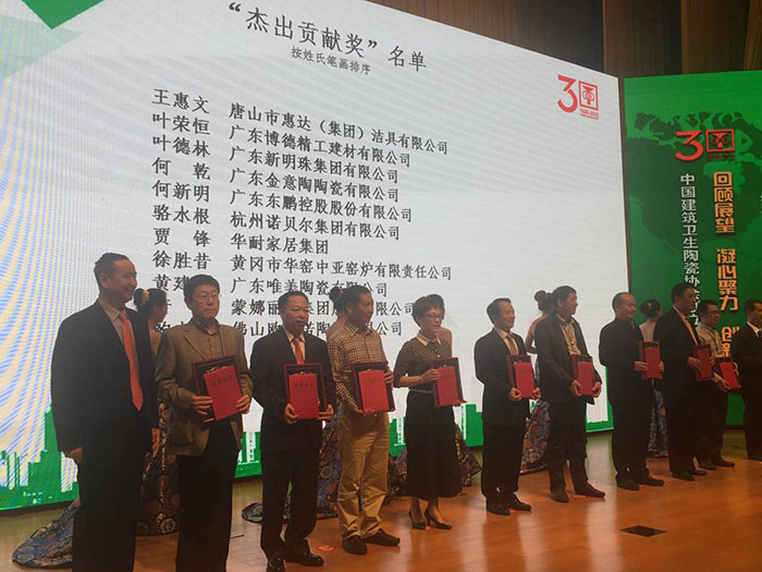 2016年10月12日,以“开拓创新,阔步奋世”为主题的中国建筑卫生陶瓷协会创立30周年庆典暨七届三次理事会议在淄博举行,作为陶卫行业权威行业协会之一,中国建筑卫生陶瓷协会全面回顾总结了协会和行业30年主要工作,为三十年来作杰出贡献的先进个人及企业进行表彰,广东香蕉视频黄版精工建材有限公司董事长兼总经理叶荣恒荣获“杰出贡献奖”。