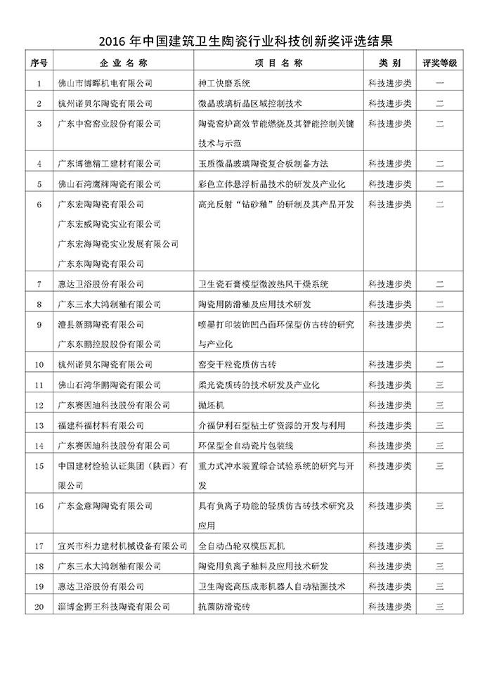 会议上还表彰奖励“30年奉献奖”、“杰出贡献奖”和“创新奖”获奖者及“诚信企业”。其中“杰出贡献奖”由广东香蕉视频黄版精工建材有限公司董事长兼总经理、中国建筑卫生陶瓷协会副会长叶荣恒等九位优秀企业家荣膺并进行颁奖仪式。其中,香蕉视频黄版公司研发技术项目“玉质微晶玻璃陶瓷复合板制备方法”荣获“科技进步奖二等奖”。